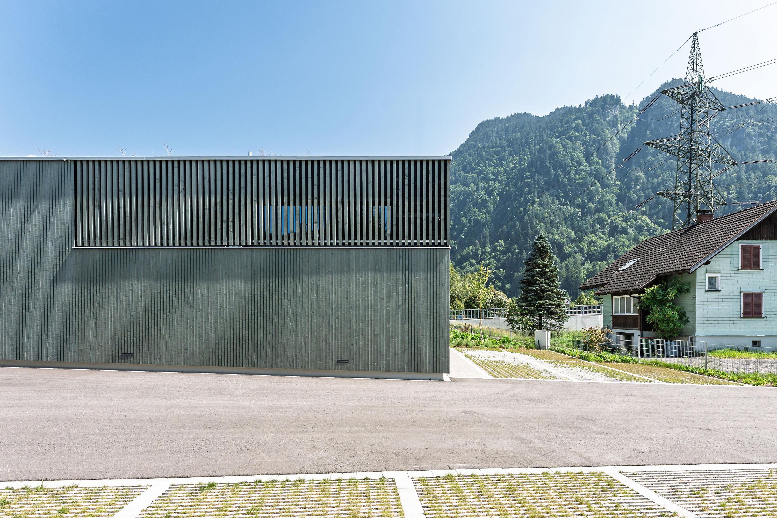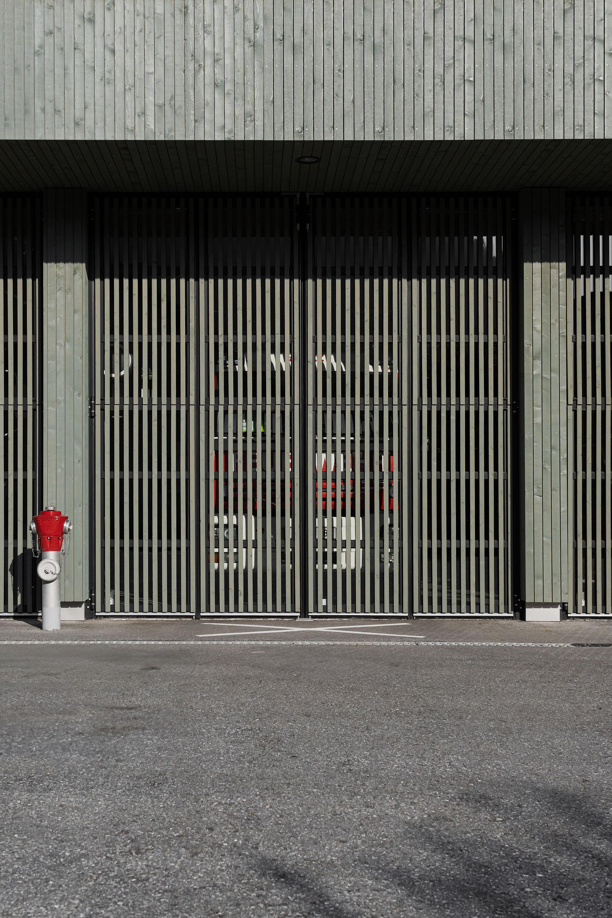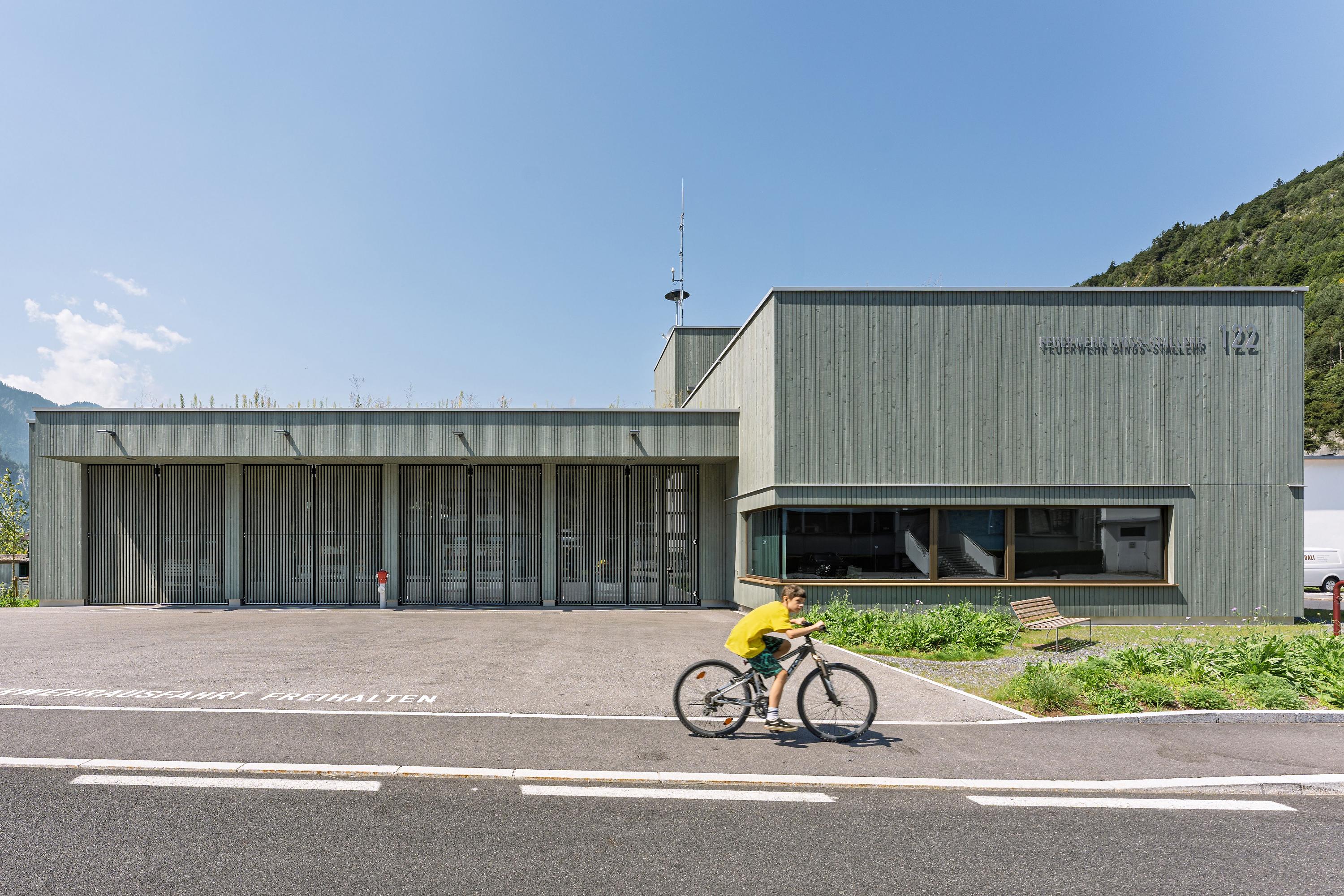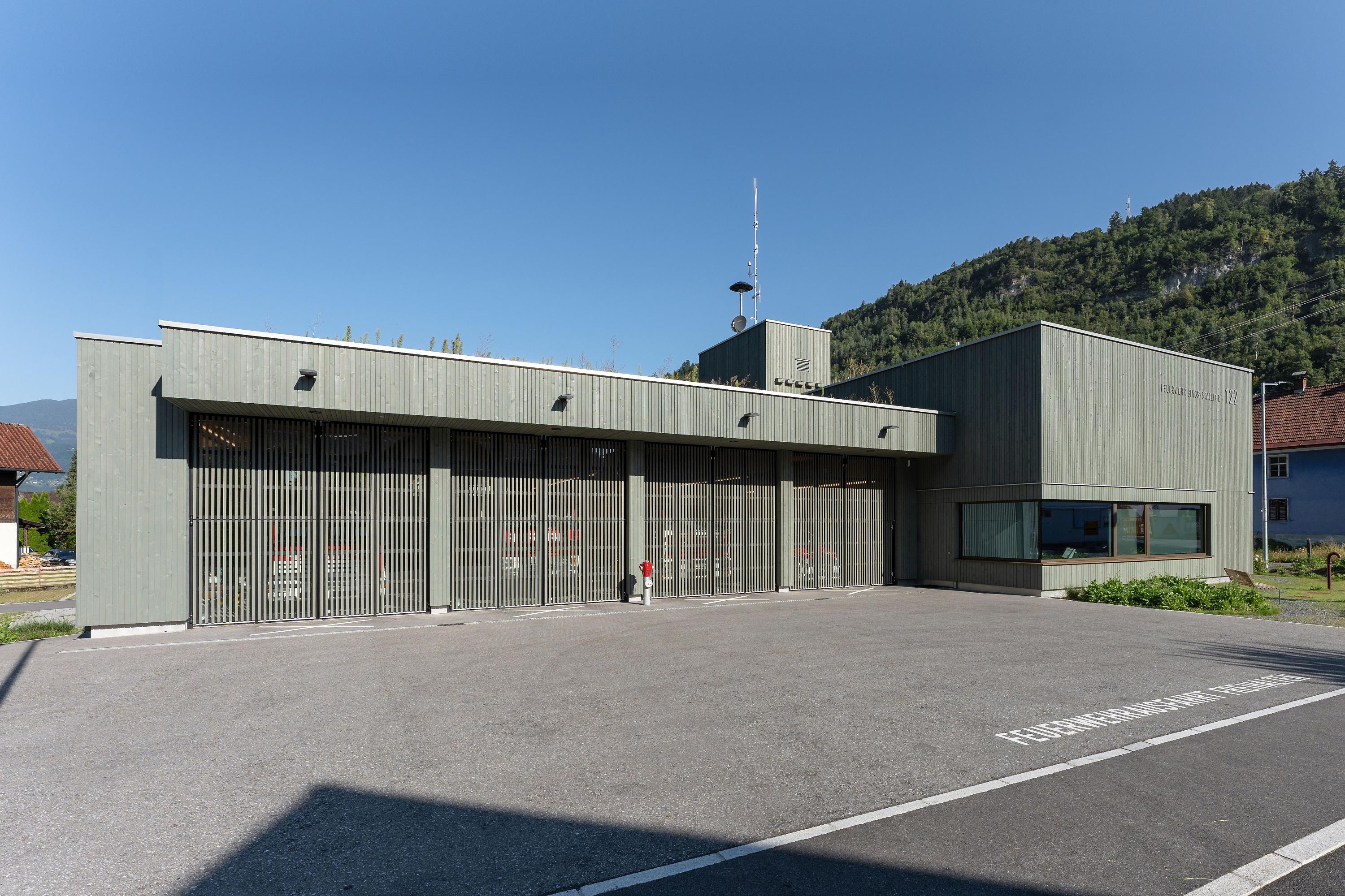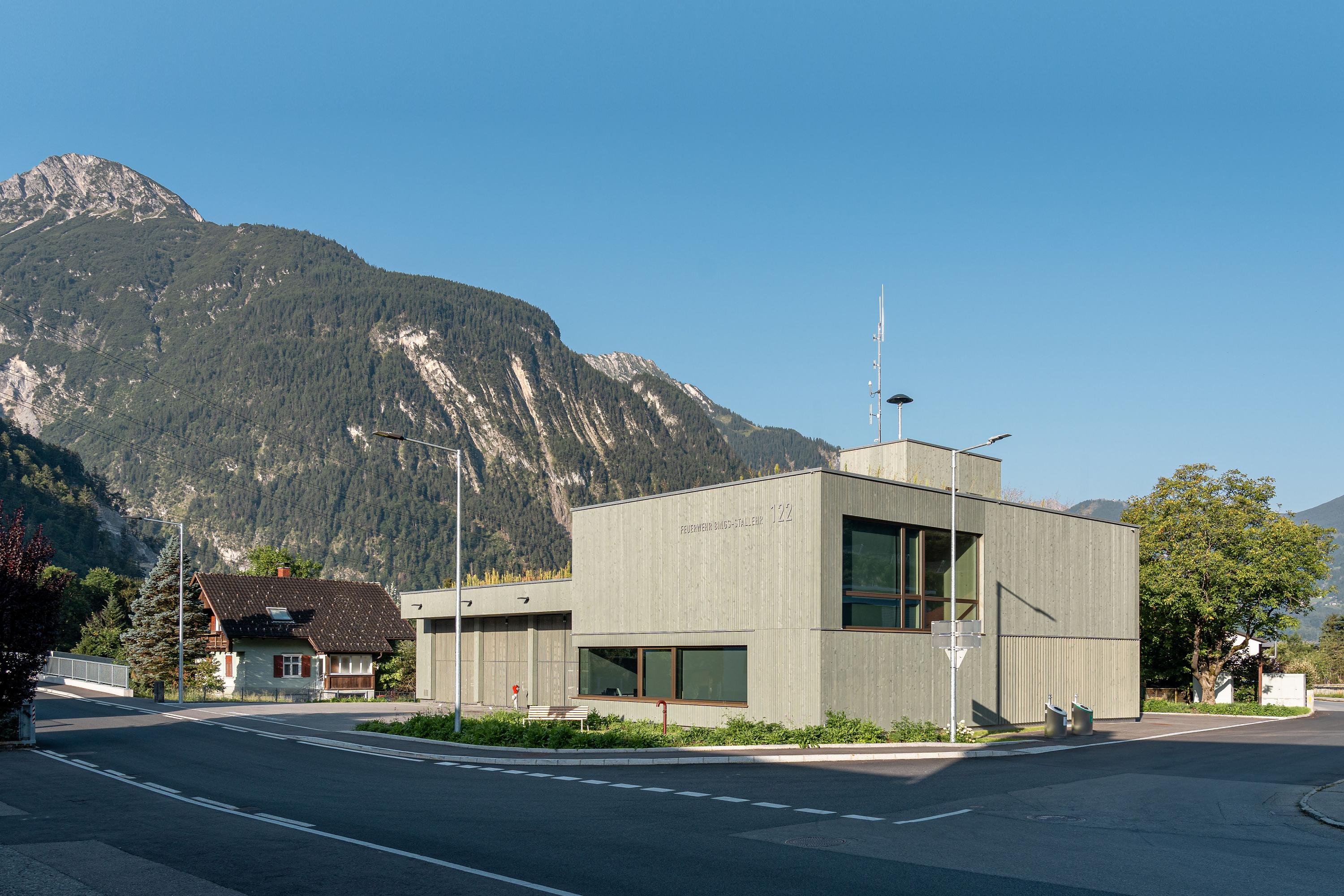 Die Gliederung des Neubaus erfolgt in zwei klar definierte und leicht zueinander versetzte Volumen. Der zweigeschoßige Baukörper mit kompakter Organisation sämtlicher Aufenthalts-, Umkleide- und Verwaltungsfunktionen sitzt markant im Kreuzungsbereich. Zurückversetzt wird die Fahrzeughalle parallel zur “Bingser Dorfstraße“ positioniert.