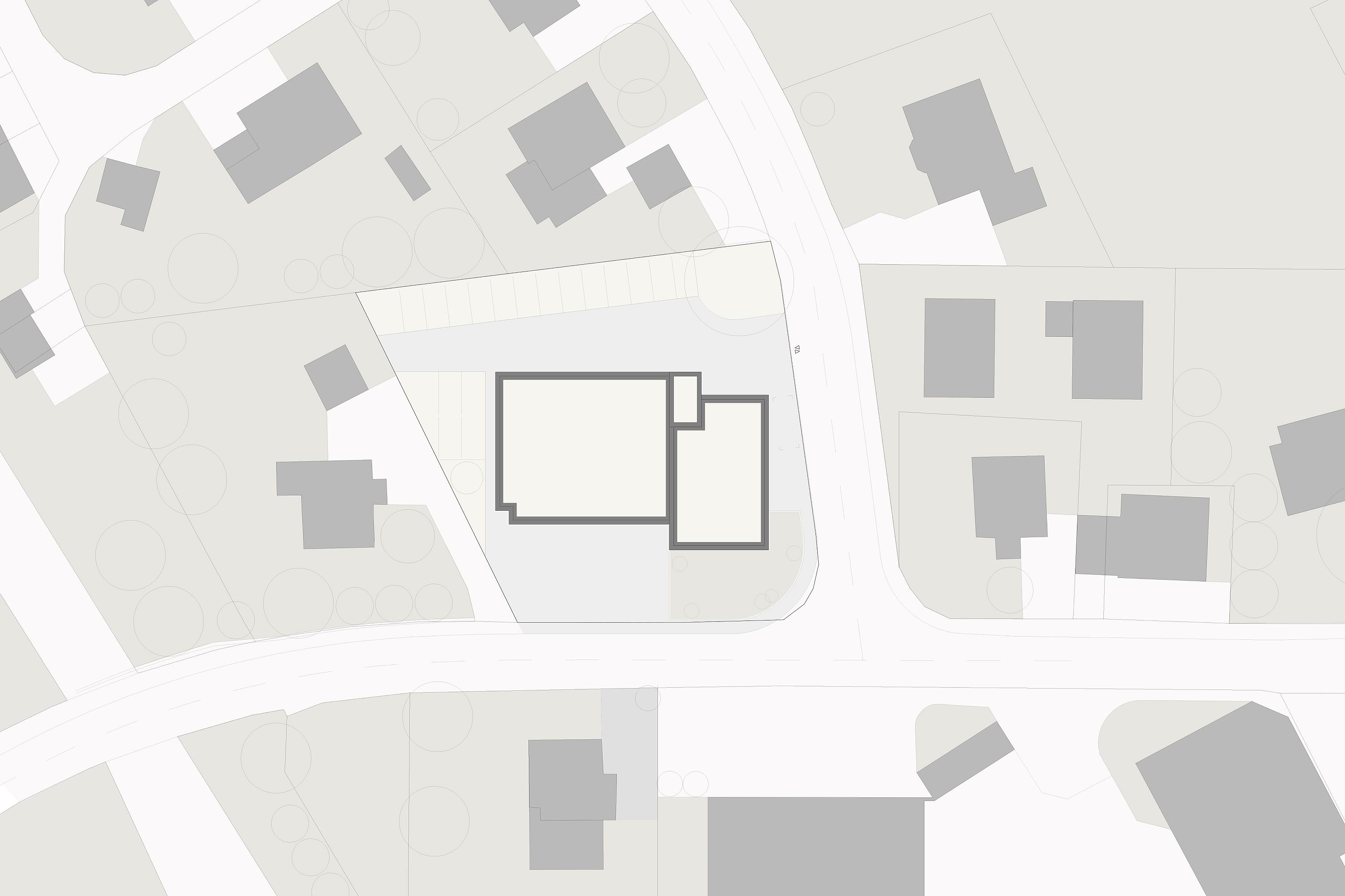 Das Grundstück an der Bingser Dorfstraße liegt genau im Übergang von kleinkörniger, durchgrünter Bebauung der Bingser Siedlungshäuser zu den großmaßstäblichen Volumen des Gewerbegebietes. Straßenraumprägend sind vorwiegend 2½-geschossige Fassaden in rhythmischen Abstand. Der vorliegende Entwurf orientiert sich an der städtebaulich kleingliedrigen Struktur und gibt dem bestehenden Nussbaum den angemessenen Raum.
