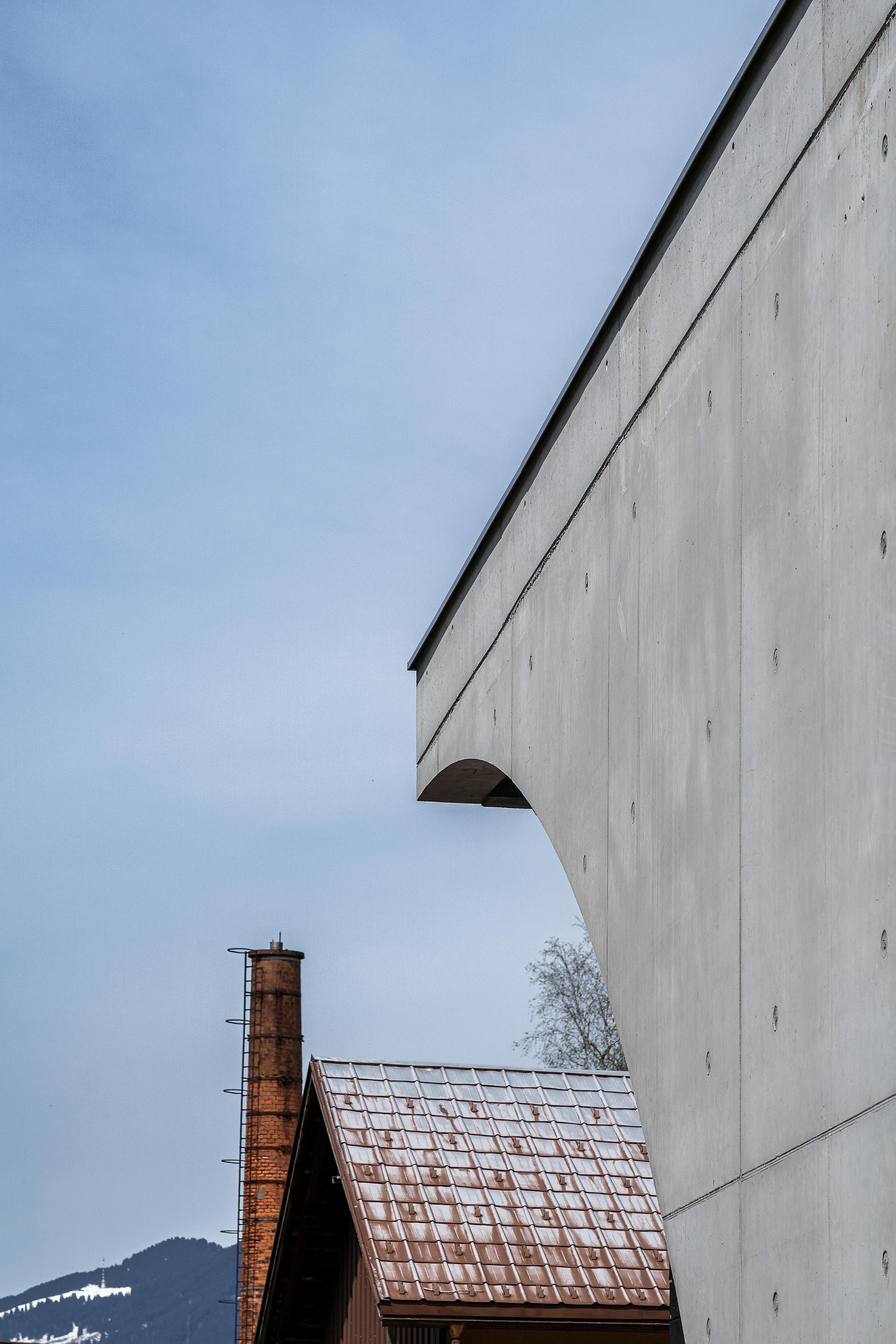 Die skulpturalen Rundbögen sind eine Reminiszenz an den angrenzenden Viadukt des Werkskanals der Klarenbrunnfabrik und zugleich Hauptstatik und formgebendes Element des Gebäudes.
