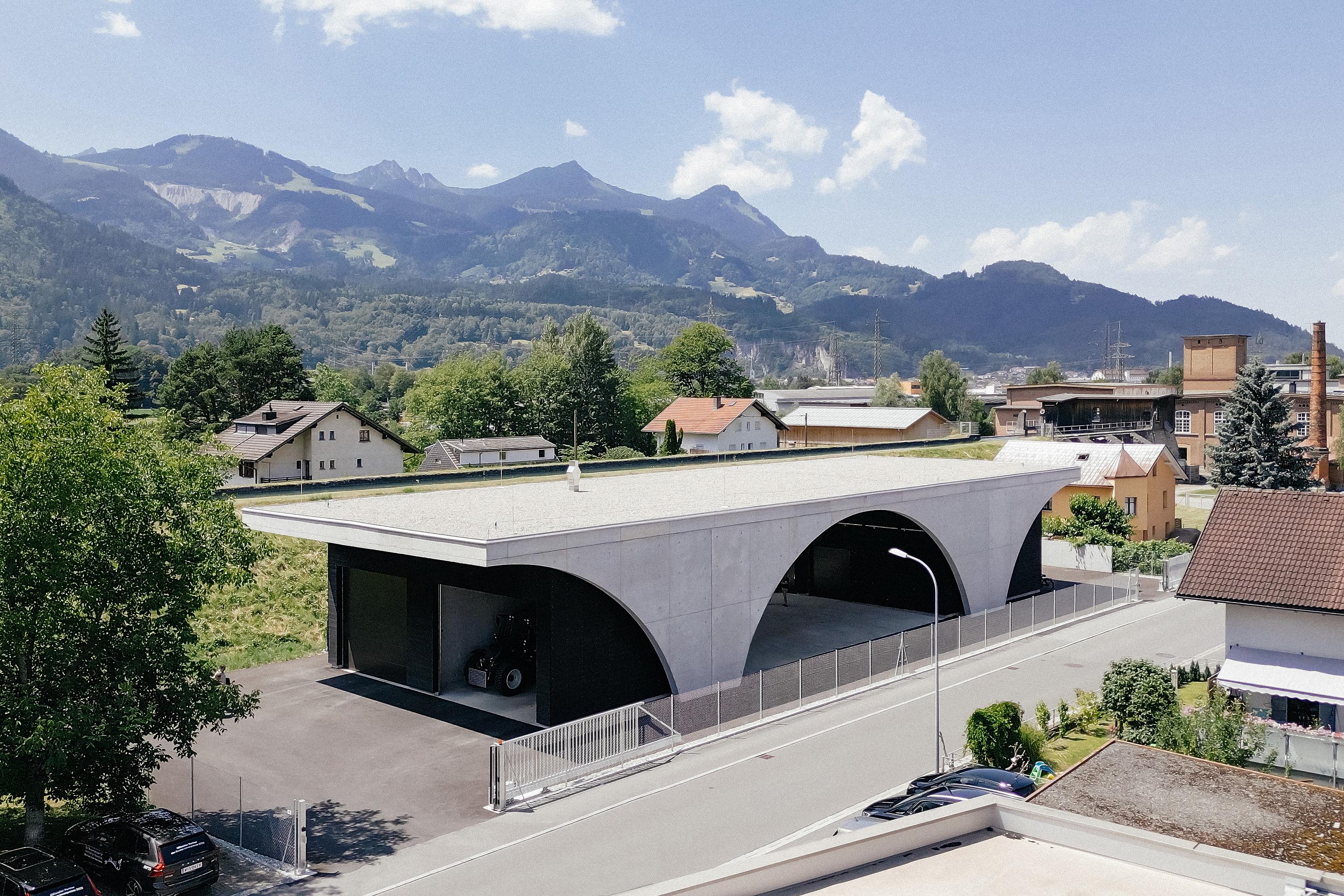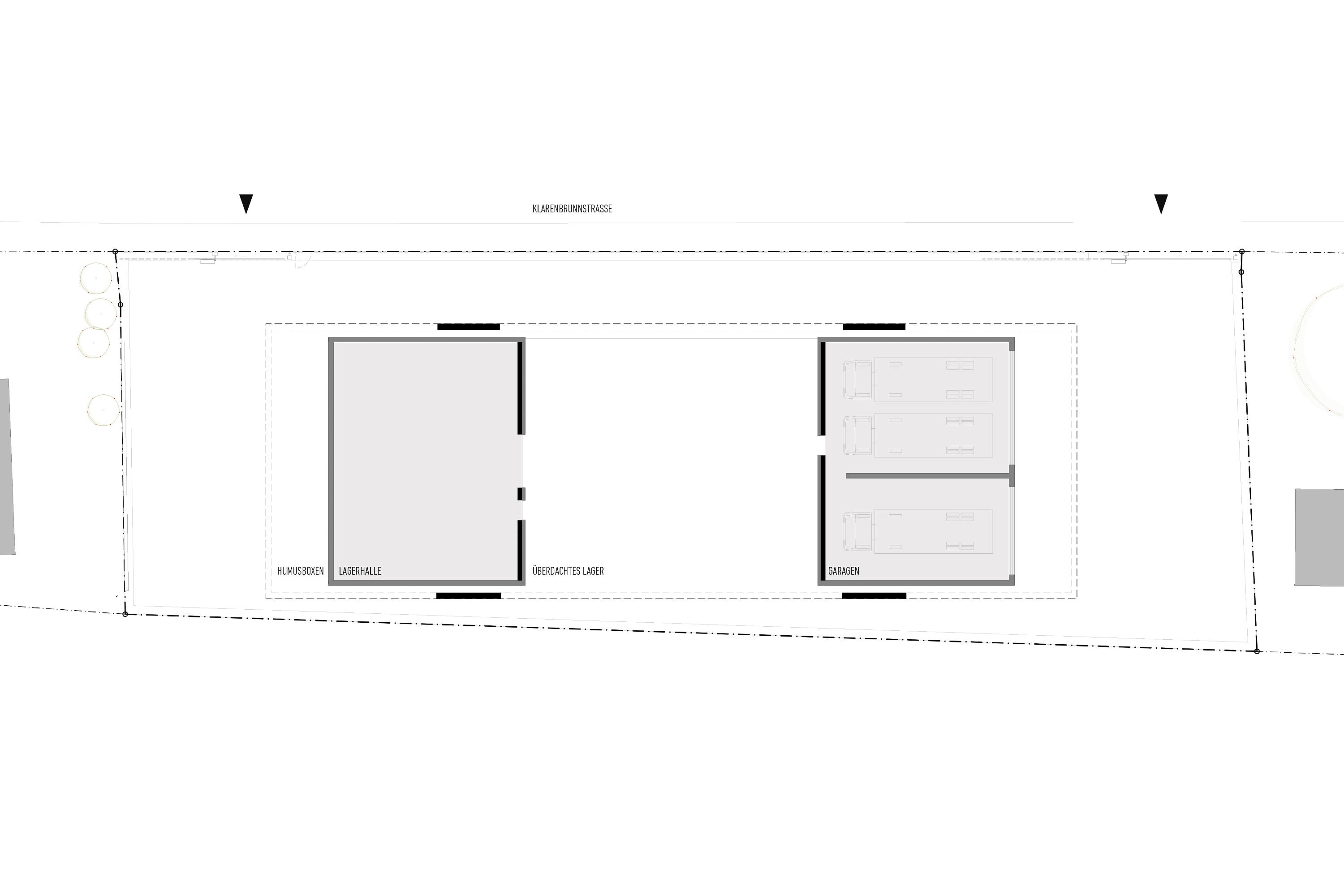 Im Raumprogramm wurden rund 600m2 unterschiedlichster Nutzflächen gefordert. Neben Lagerflächen, Rangierflächen und Flächen für die städtische Gärtnerei mussten auch LKW-Garagen untergebracht werden. Die Bauidee, welche dem Projekt zugrunde liegt, ist es, sämtliche Nutzungen sprichwörtlich unter einem Dach zu vereinen. Geschlossene Nutzungen sind in zwei Hallen in Holzbauweise untergebracht, welche durch ein verbindendes Stahlbetondach überspannt werden. Zugleich bietet das Dach auch Schutz für die offenen Lager- und Rangierflächen.