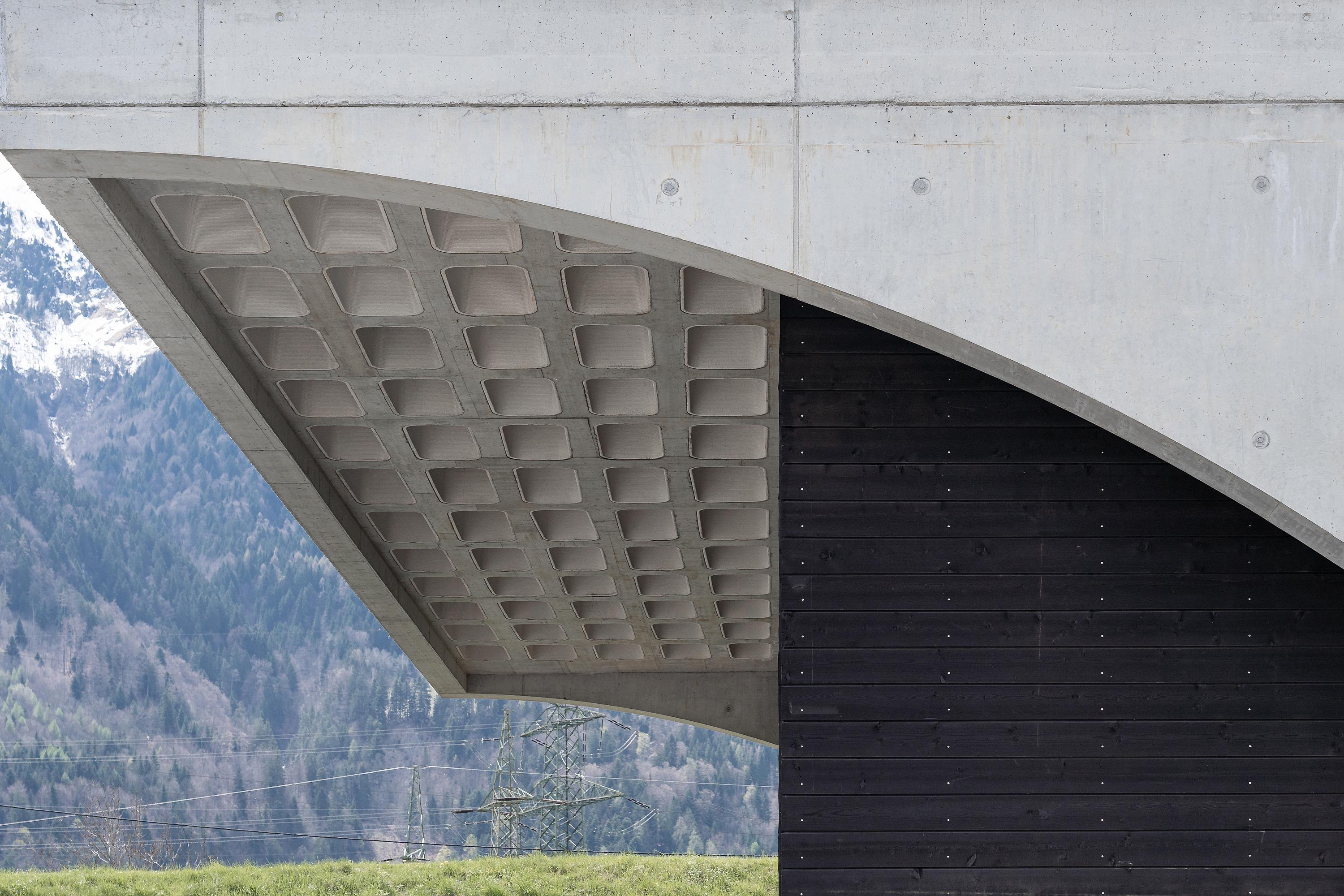 Auf den beiden 46m langen Stützbögen liegt die ca. 700m2 große Decke, welche als Ortbetonkassettendecke errichtet wurde.
