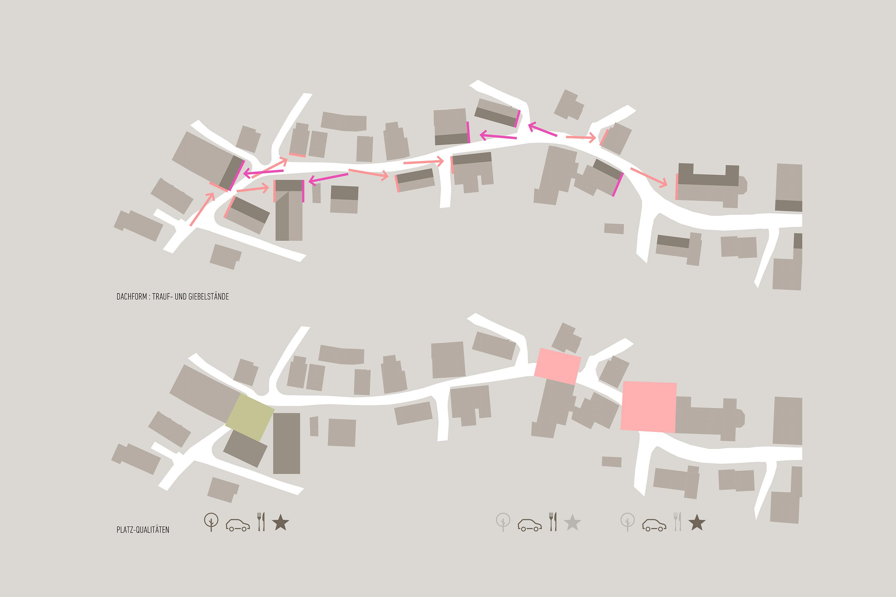 Der Dorfplatz soll in das künftige Straßen- und Wegekonzept der Gemeinde eingebunden werden. Ein Geviert aus Bäumen wird als Raum im Raum eine wohltuend kühle Zone erzeugen, die im Sommer als Gastgarten genutzt wird. Zugleich ist durch die Setzung der Bäume eine zwanglose Integration des Fahrverkehrs in das Platzgefüge möglich. Durch diese sekundäre Raumbildung gelingt es, die Bewegungsführungen für den motorisierten Verkehr durch räumliche Elemente zu gewährleisten. Natürliche Gehlinien (fußläufige Vernetzung) werden durch die Möblierung und Baumsetzung zusätzlich unterstützt.