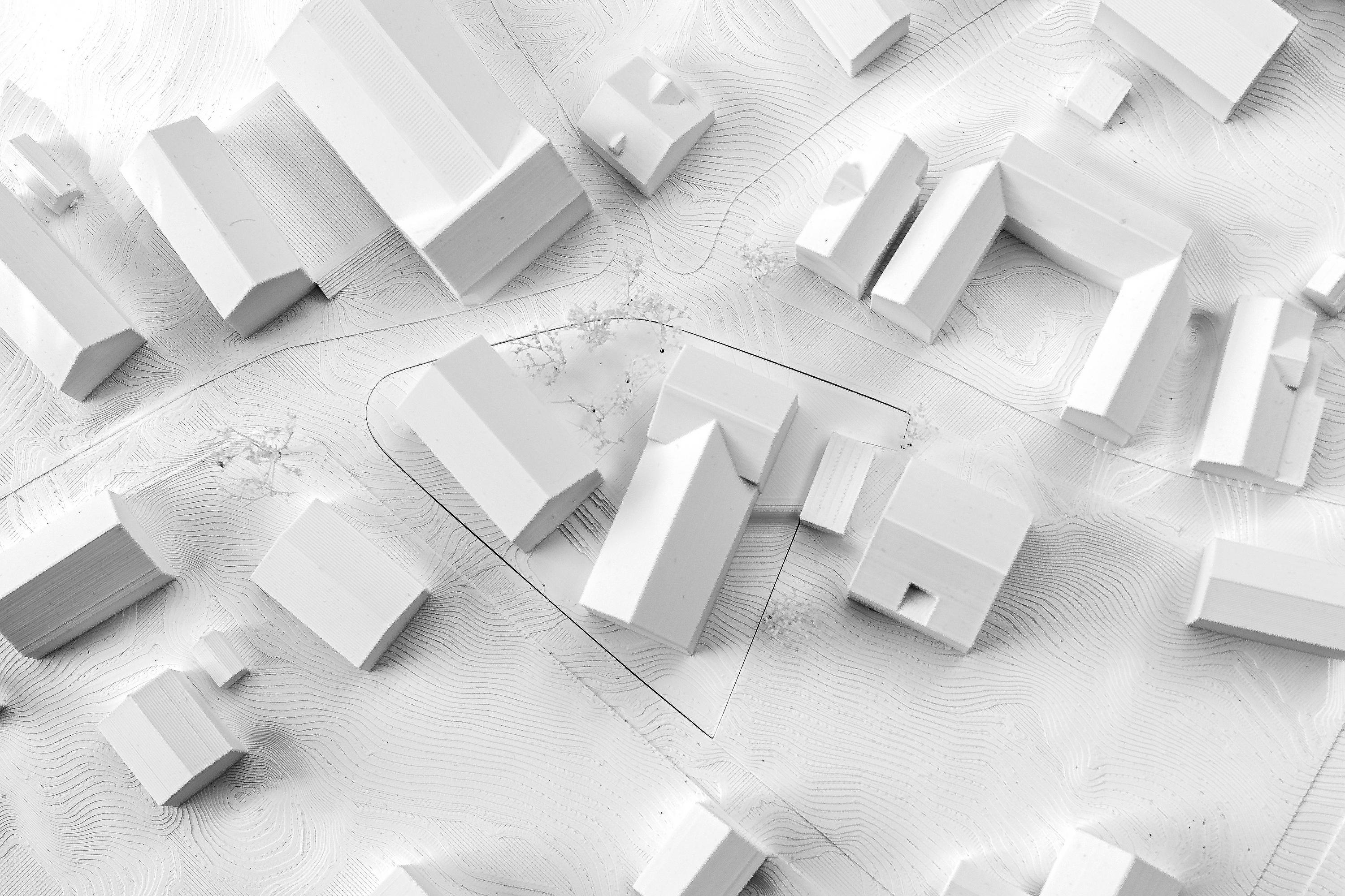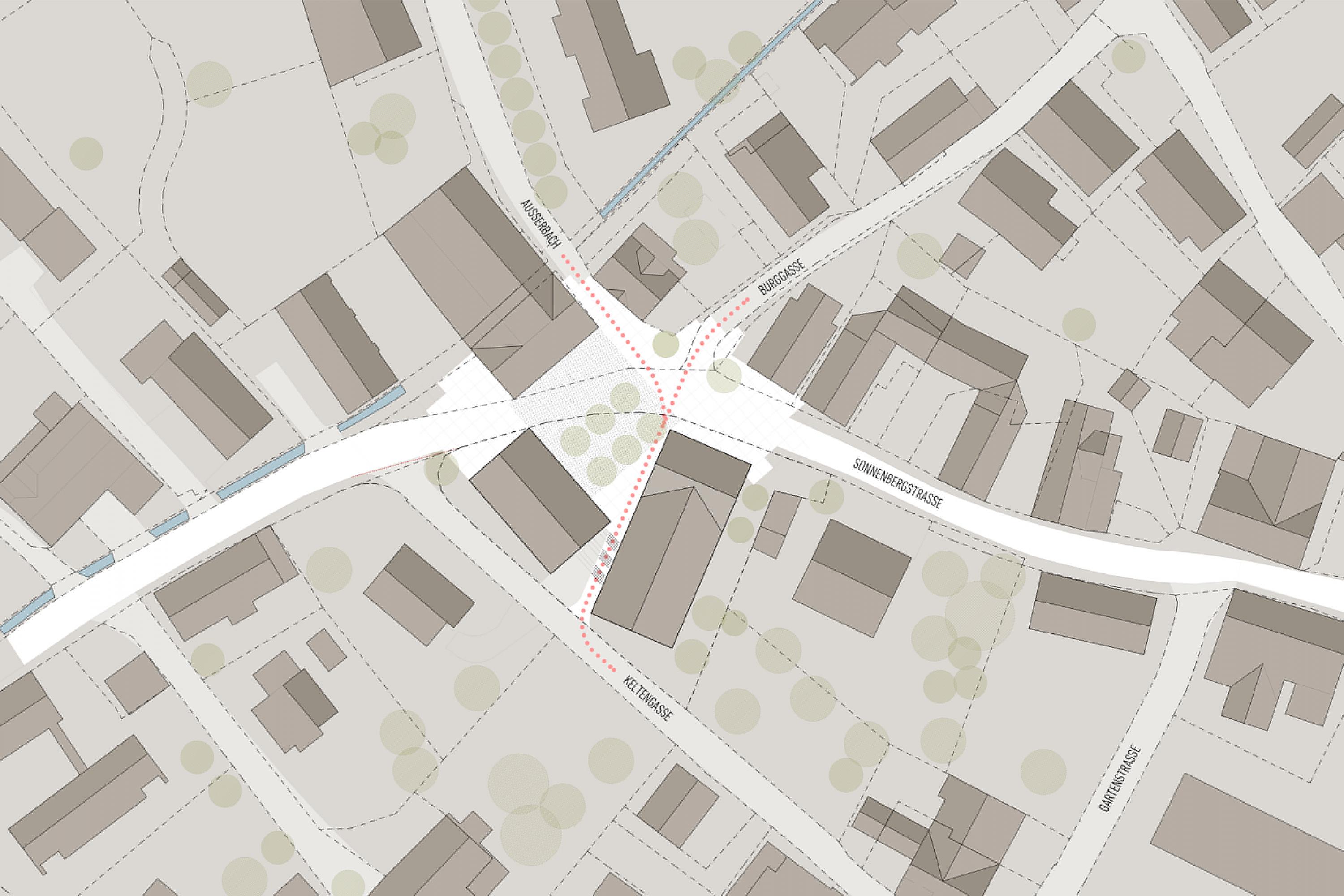 Das Planungsgebiet liegt am nordwestlichen Ende des „nüziger“ Dorfzentrums, welches sich als Abfolge von kleinen Plätzen und Räumen von der Pfarrkirche bis zum Gemeindeamt erstreckt. Straßenraumprägend für die Sonnenbergstraße sind giebel- und traufständige Fassaden von freistehenden Satteldachhäusern mit 2 bis 2,5 Geschossen. Zwischen den beiden Torsituationen im Südosten und im Nordwesten der Sonnenbergstraße, finden sich allerdings keine Plätze, welche eine ausreichende Größe für eine öffentliche Nutzung aufweisen. Insbesondere das engere Planungsgebiet um den bestehenden Gasthof Krone und das Gemeindeamt ist geprägt durch Rest- und Parkplatzflächen am Straßenrand. Der vorliegende Entwurf will über die geforderten Bauaufgabe hinaus einen Dorfplatz mit Aufenthaltsqualität anbieten, der Nüziders bislang fehlt.