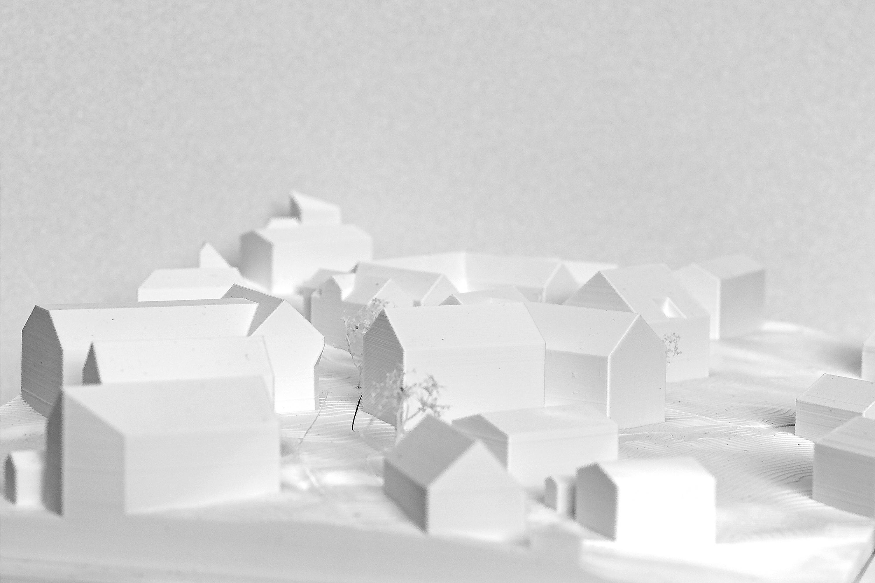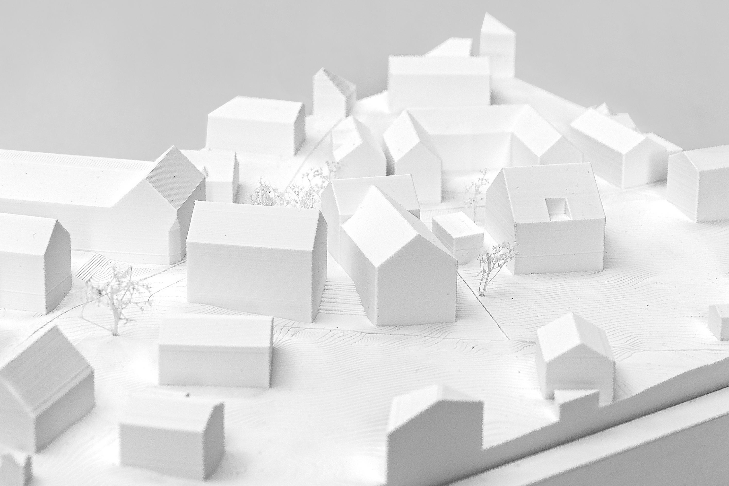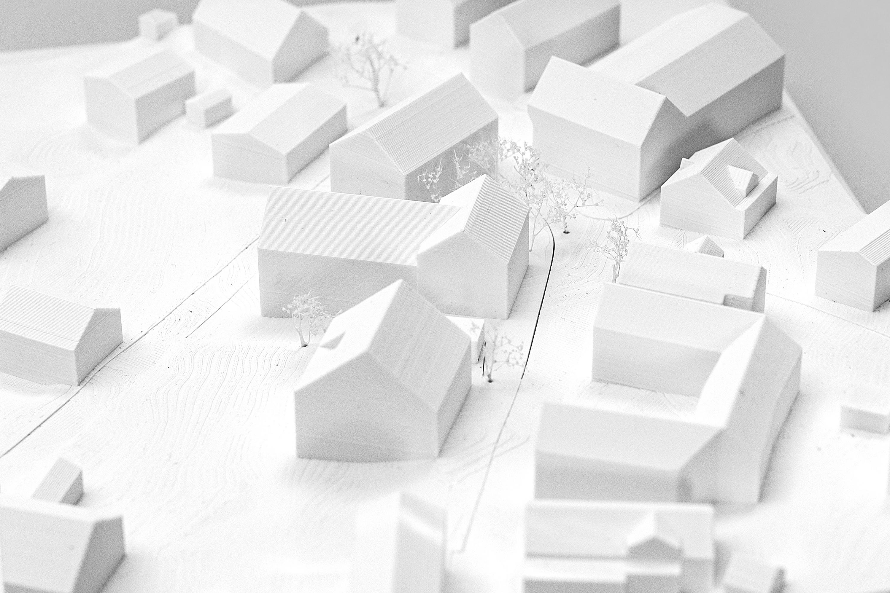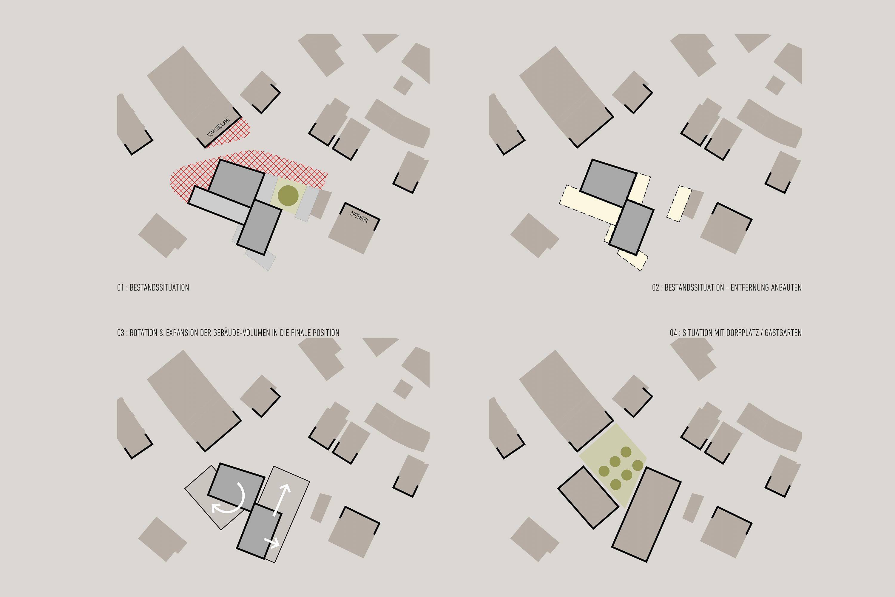 Das Raumprogramm wird in zwei ortsmaßstäbliche Volumina aufgeteilt, welche der Körnung des Planungsgebietes entsprechen. Die beiden Passtücke entwickeln sich aus den bestehenden Baukörpern des Gasthofes heraus, welche durch Drehung und Verschiebung so positioniert werden, das bestehende Qualitäten erhalten und zusätzliche gewonnen werden. Der neue Gasthof übernimmt die ortsbaulich wichtige Funktion der Torwirkung und tritt mit seiner Giebelfassade in Dialog mit dem Gemeindeamt. Das zweite Volumen schließt die Lücke zur Apotheke und bildet zusammen mit der Krone und dem Gemeindeamt den öffentlichen Raum. Dieser Dorfplatz bietet neben dem Gastgarten des Gasthauses auch Platz und Raum für öffentliche Nutzungen. Zwischen den Gebäuden entsteht ein öffentlicher Durchgang, der den nordwestlichen Ortsteil Außerbach mit dem südöstlich gelegenen Schulquartier fußläufig vernetzt.