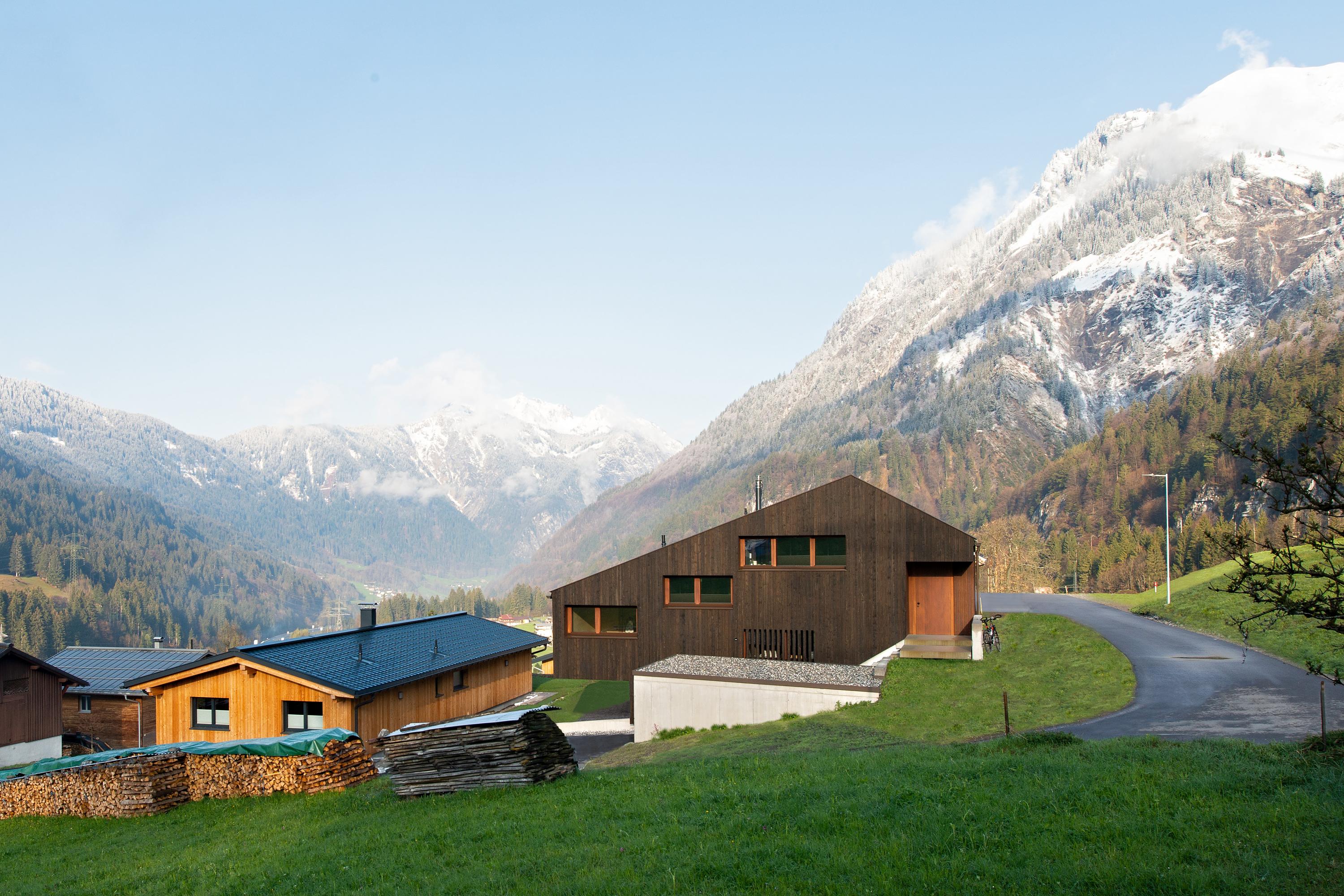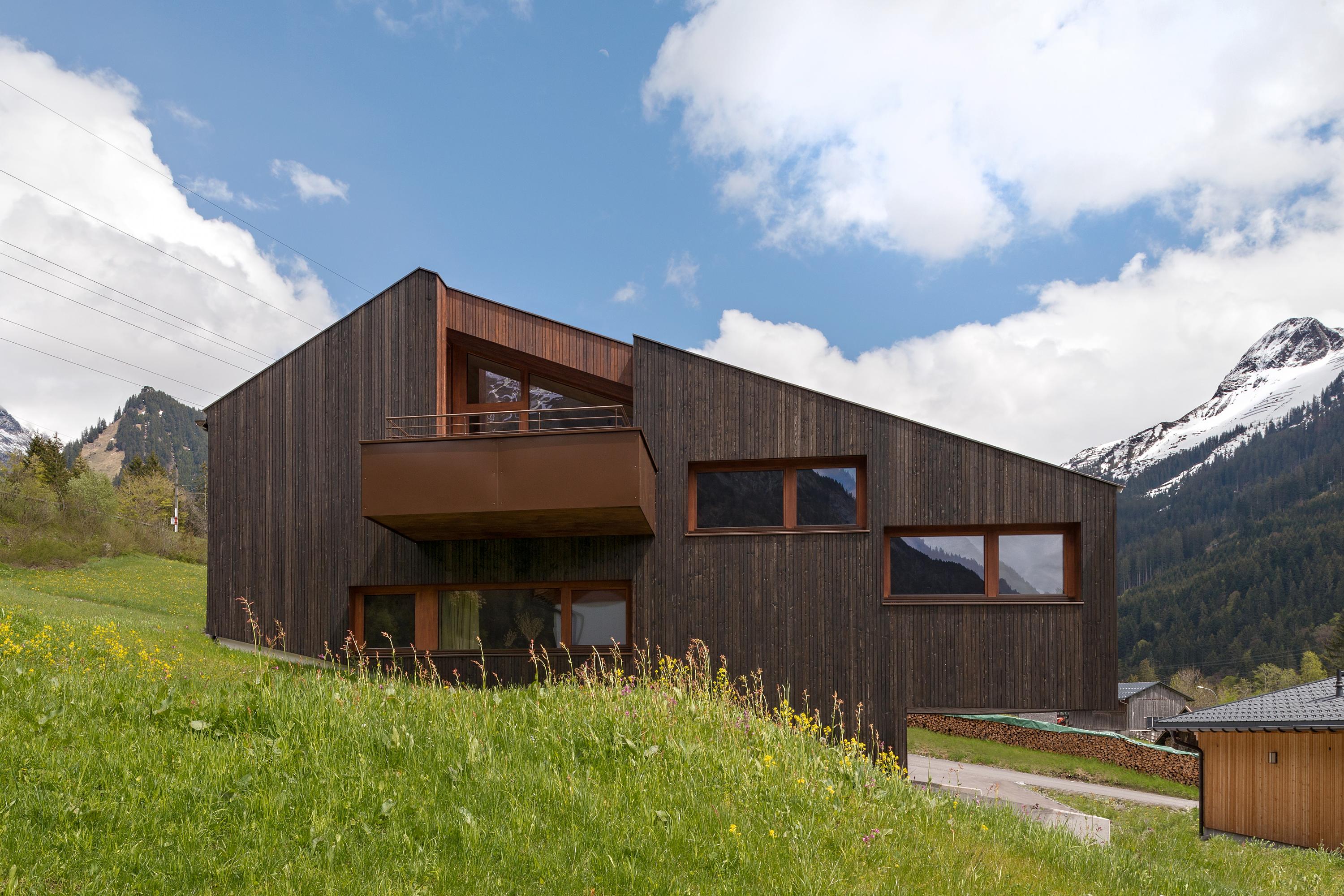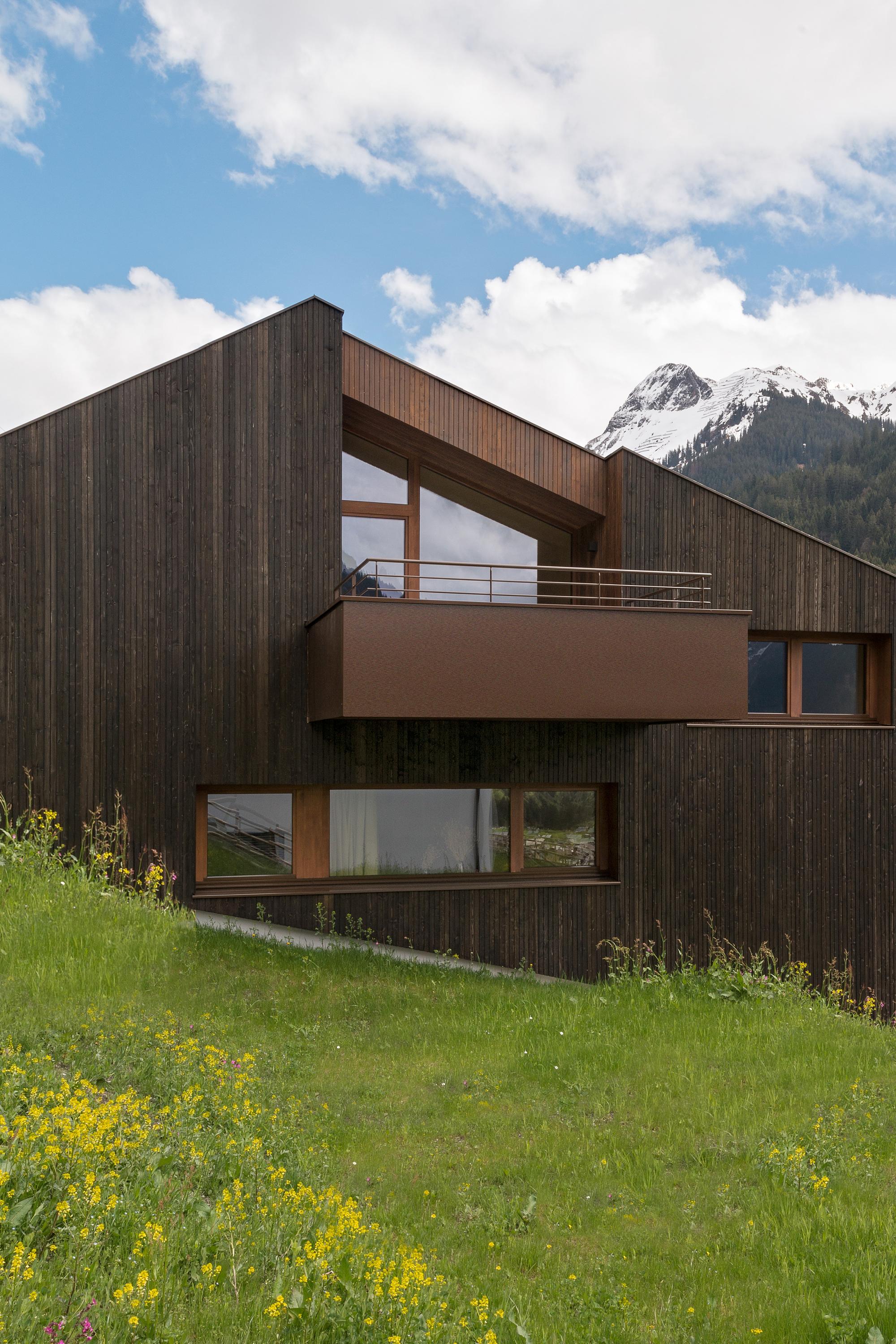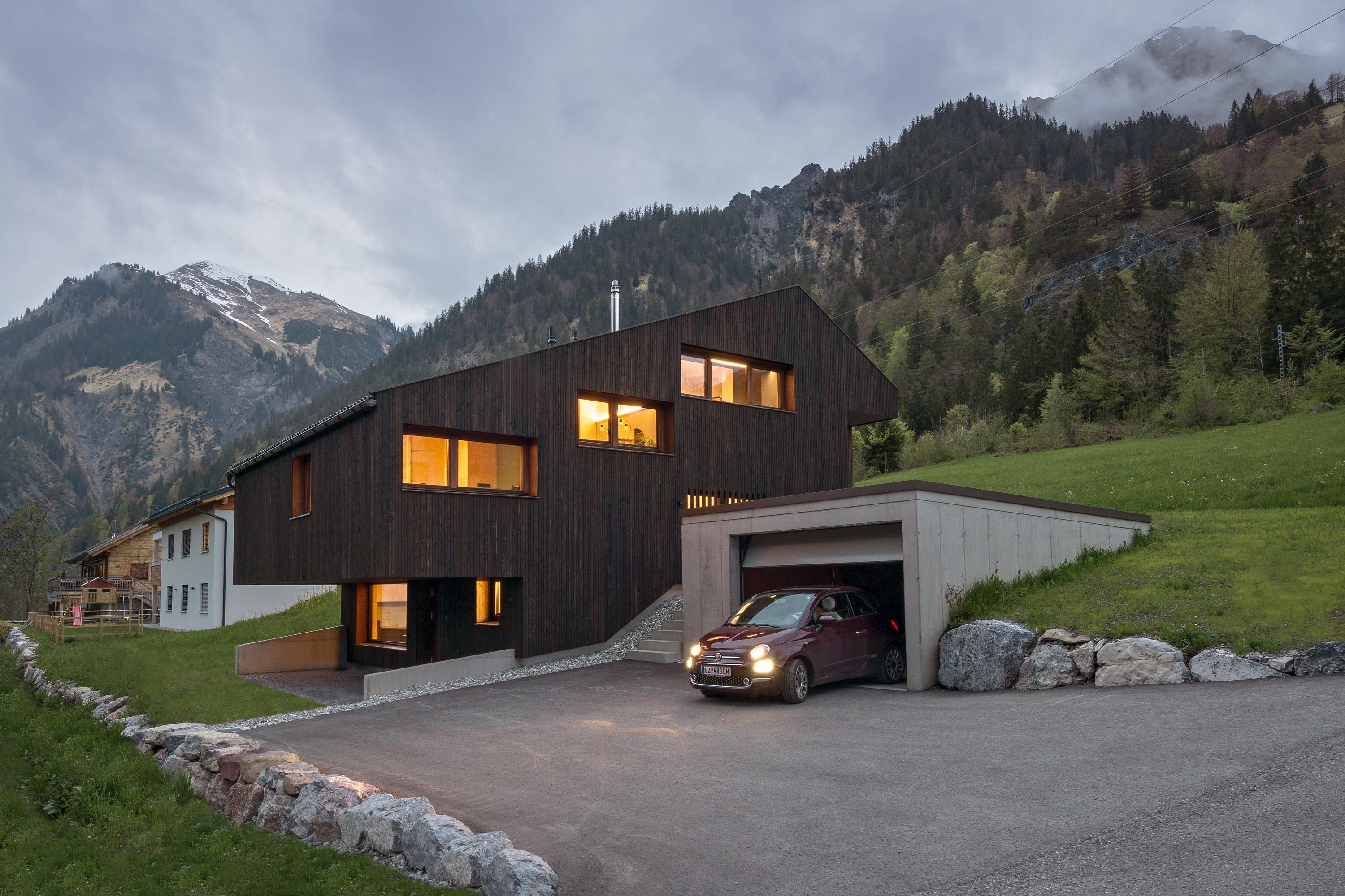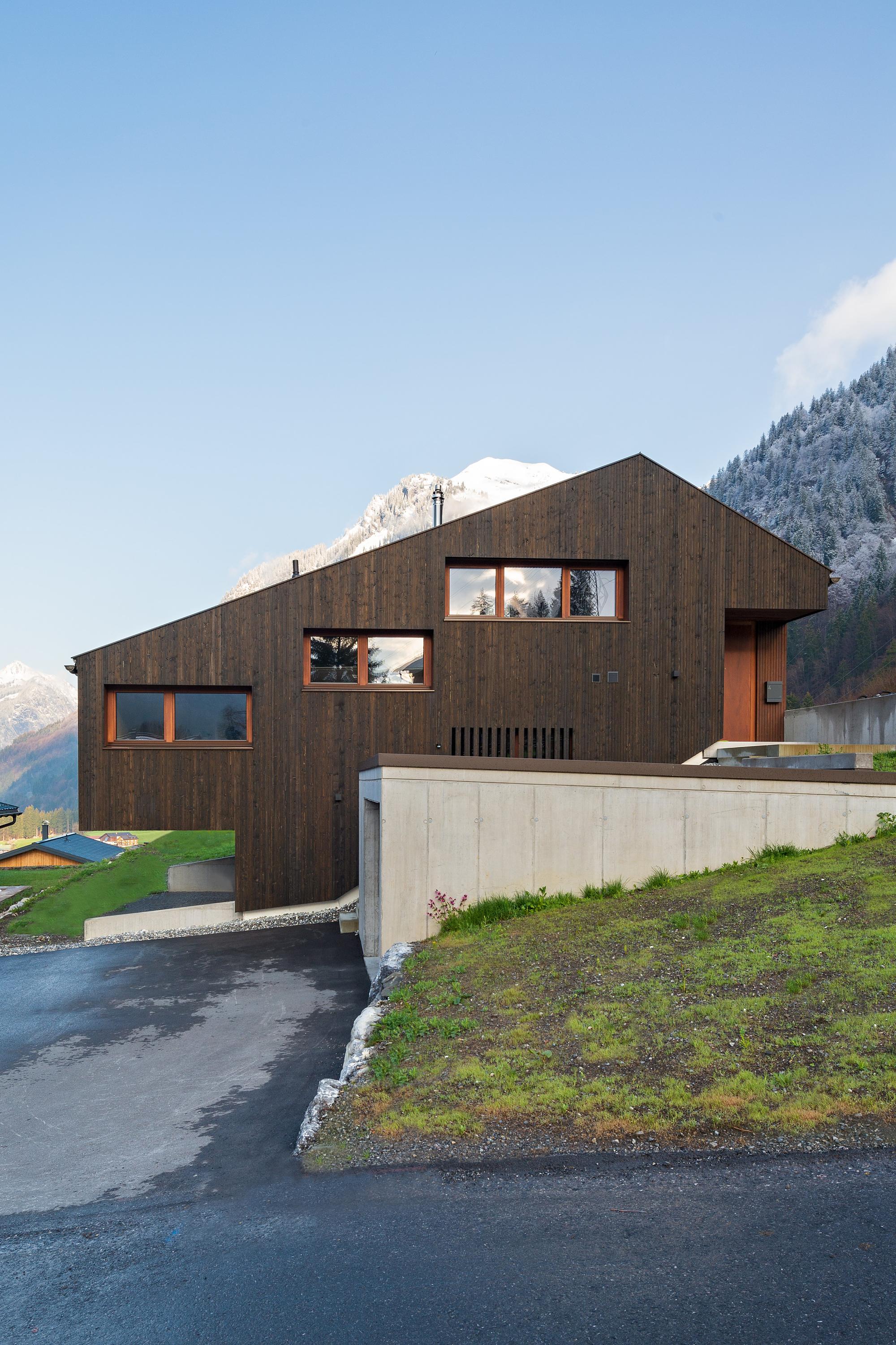 Am stark abfallenden Nordhang des Klostertals, am oberen Ende eins neu gewidmeten EFH-Quartiers gelegen, reagiert der Entwurf auf die Ost-West Orientierung des Klostertals und verzichtet zugunsten einer Fernsicht auf die klassische Süd-Ausrichtung der Umfeld-Bebauung.