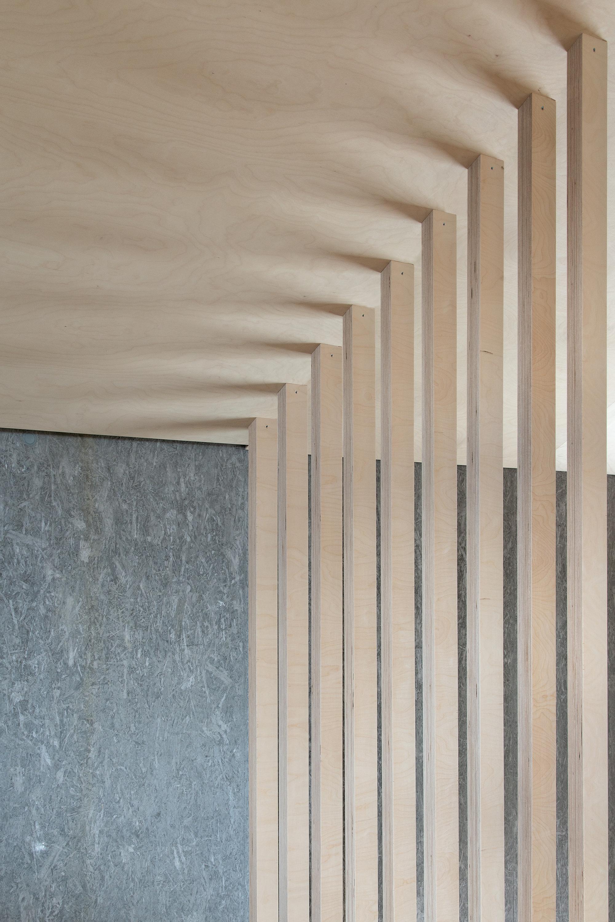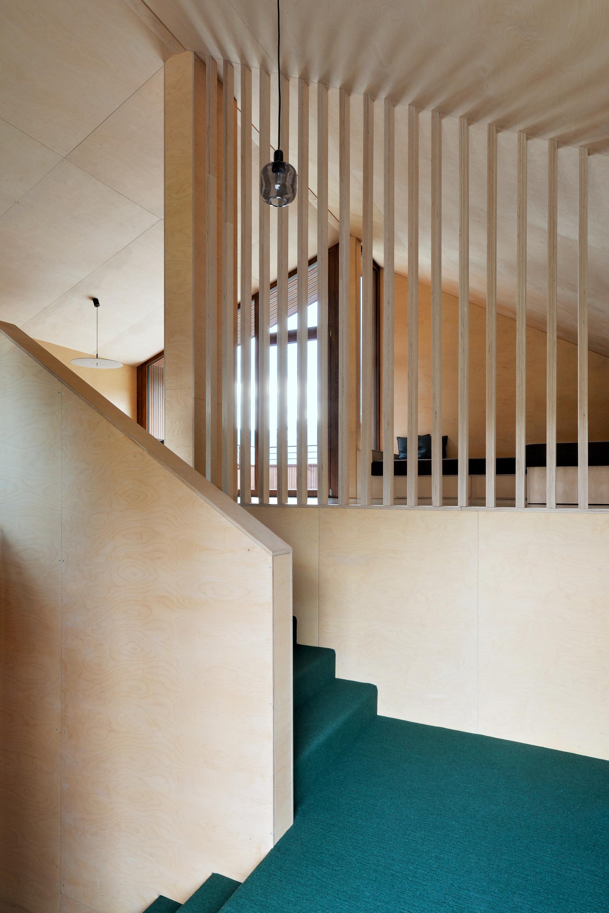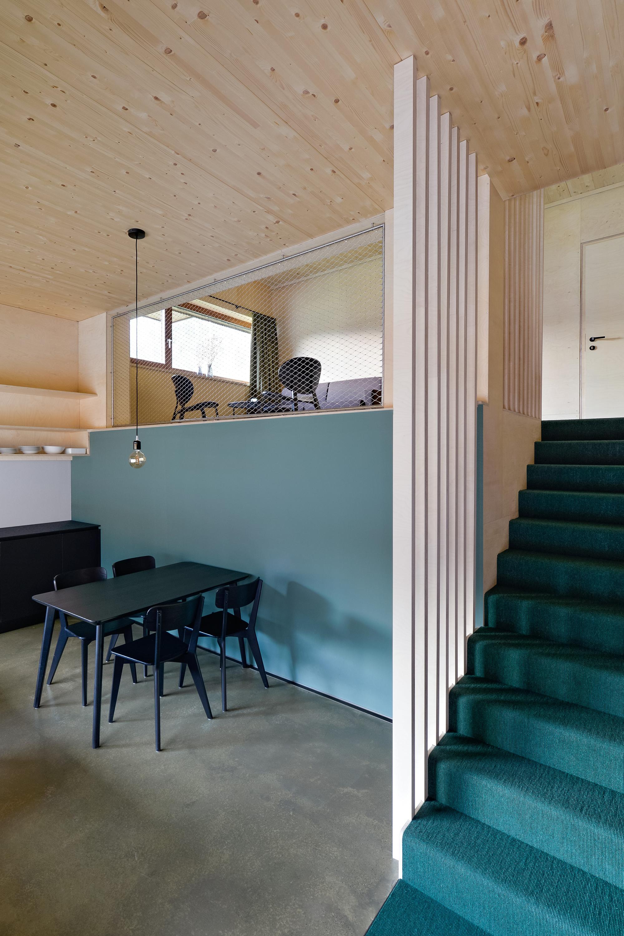 Sowohl das asymmetrische Satteldach als auch das Raumgefüge mit 5 im Hangverlauf versetzten Ebenen entwickeln sich aus der Topographie. Kaskadenartig erstreckt sich die farblich akzentuierte Erschließungszone durch das Gebäude und mündet am obersten Punkt im quer eingeschnittenen Wohn-Ess- und Kochbereich.