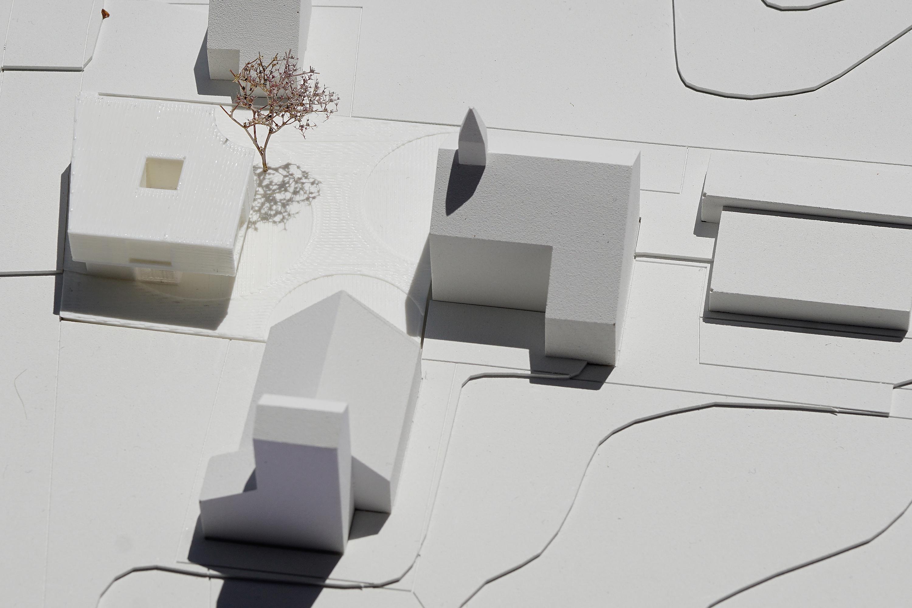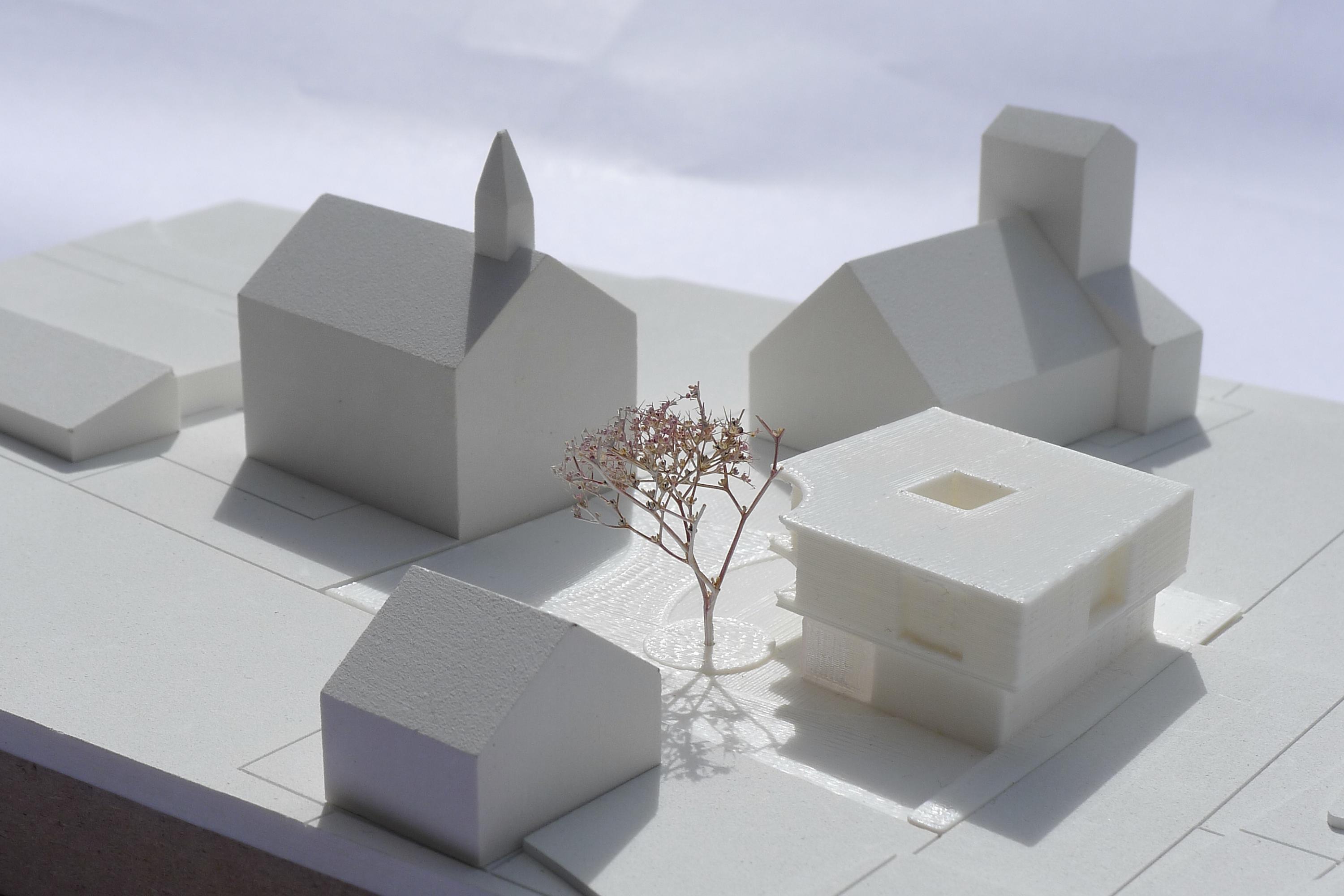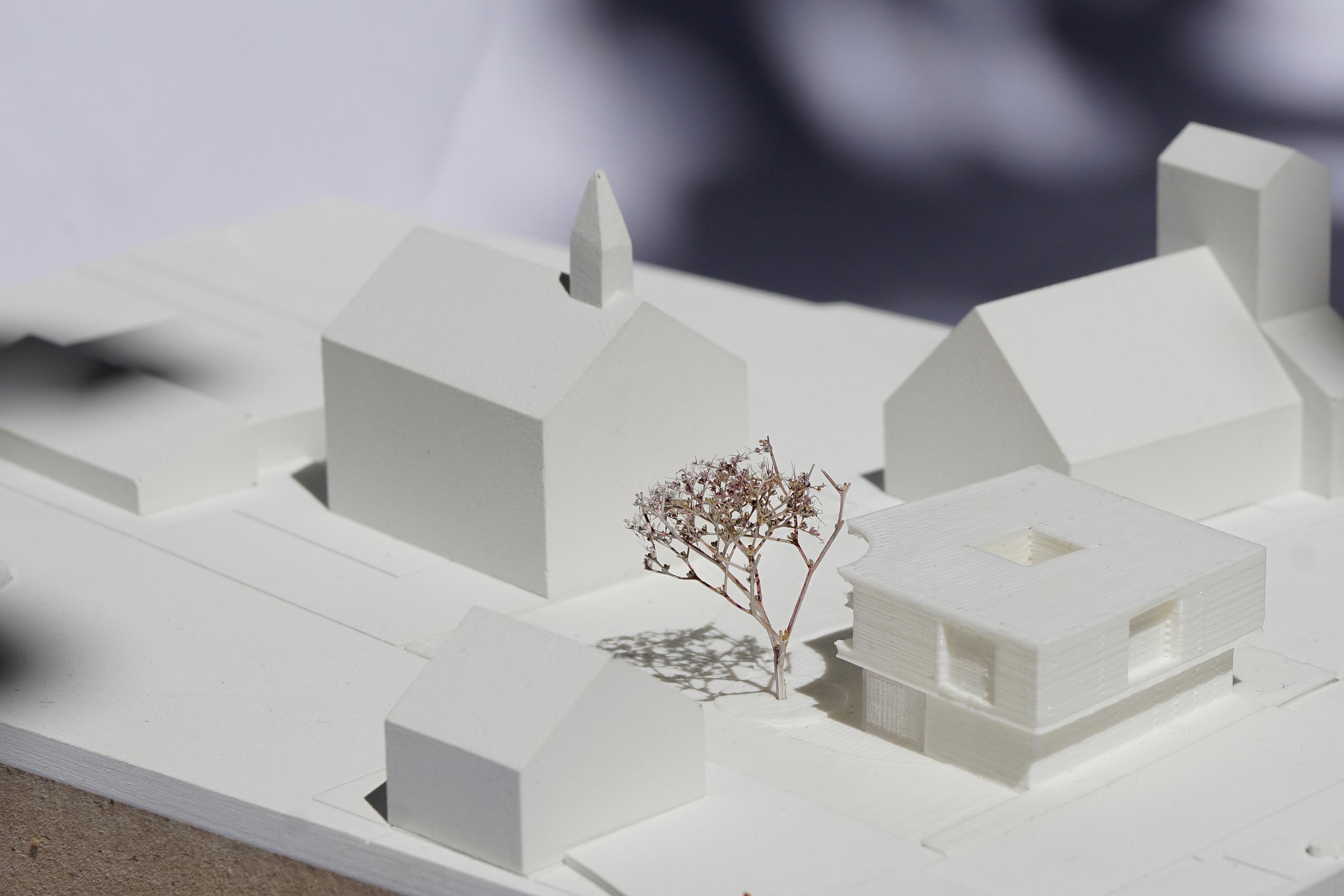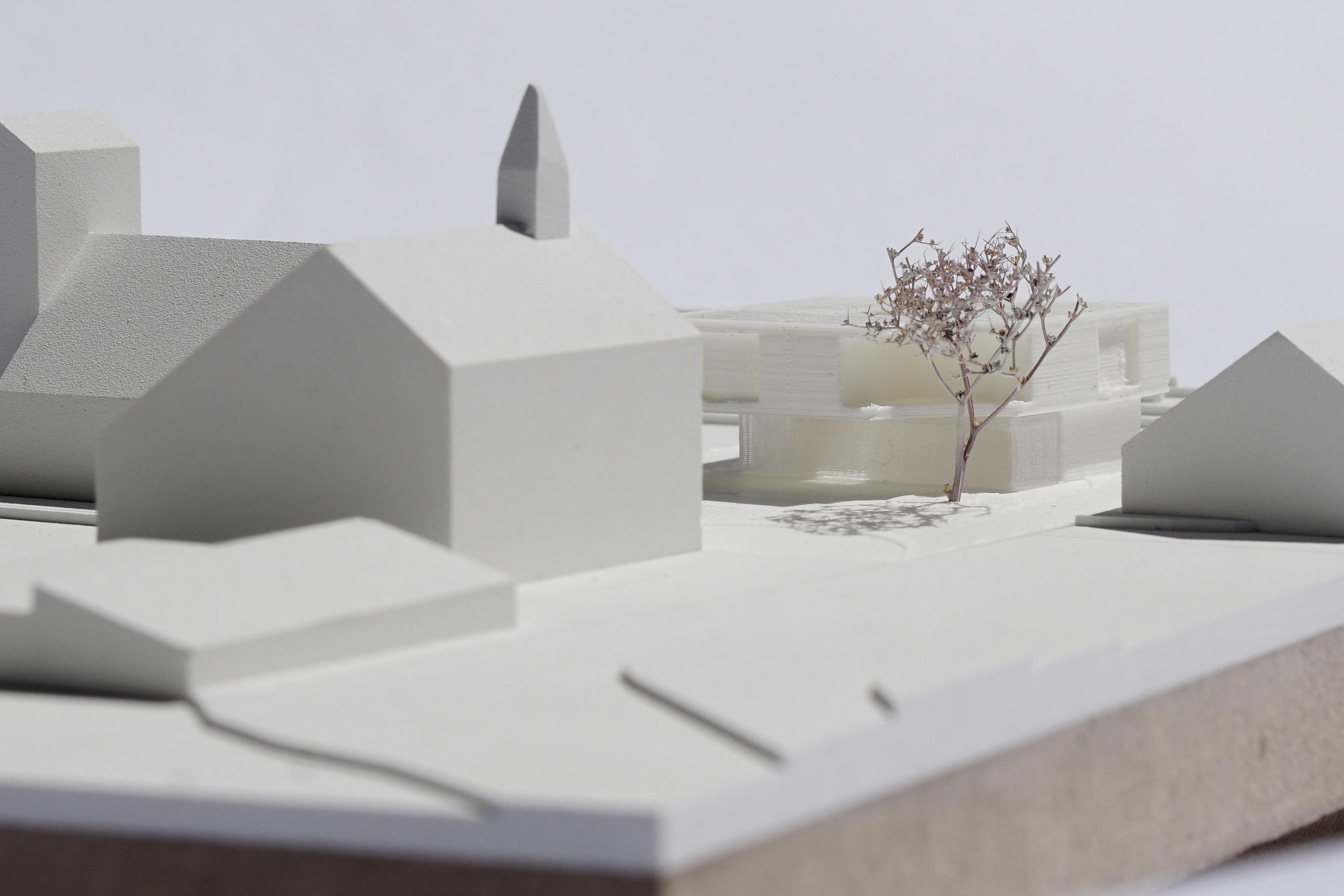 Der vorliegende Entwurf reagiert auf diese Situation mit einem Volumen, das von den ca. 400 m2 bestehender Parkfläche nur rund 190 m2 im Erdgeschoss bebaut. Die verbleibende Freifläche wird dem Platz zwischen bestehender Schule und Kirche zugewiesen, der dadurch stark an Qualität gewinnt und zum „Dorfplatz“ wird. Rund 80m2 davon werden durch das Obergeschoss überdacht und stehen Kindern, Schülern und Kirchgängern als „Loggia“ zur Verfügung. Zudem wird die bestehende Kastanie erhalten und als wichtiges Element in den Entwurf aufgenommen.